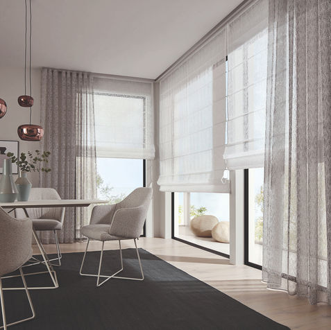 Our Roman blinds are an uncomplicated solution for efficient sun protection for your home, whether with visible slats as a design element or as a discreet version with concealed attachment, with vertical tapes or slightly playful valance. Be inspired by our large selection.